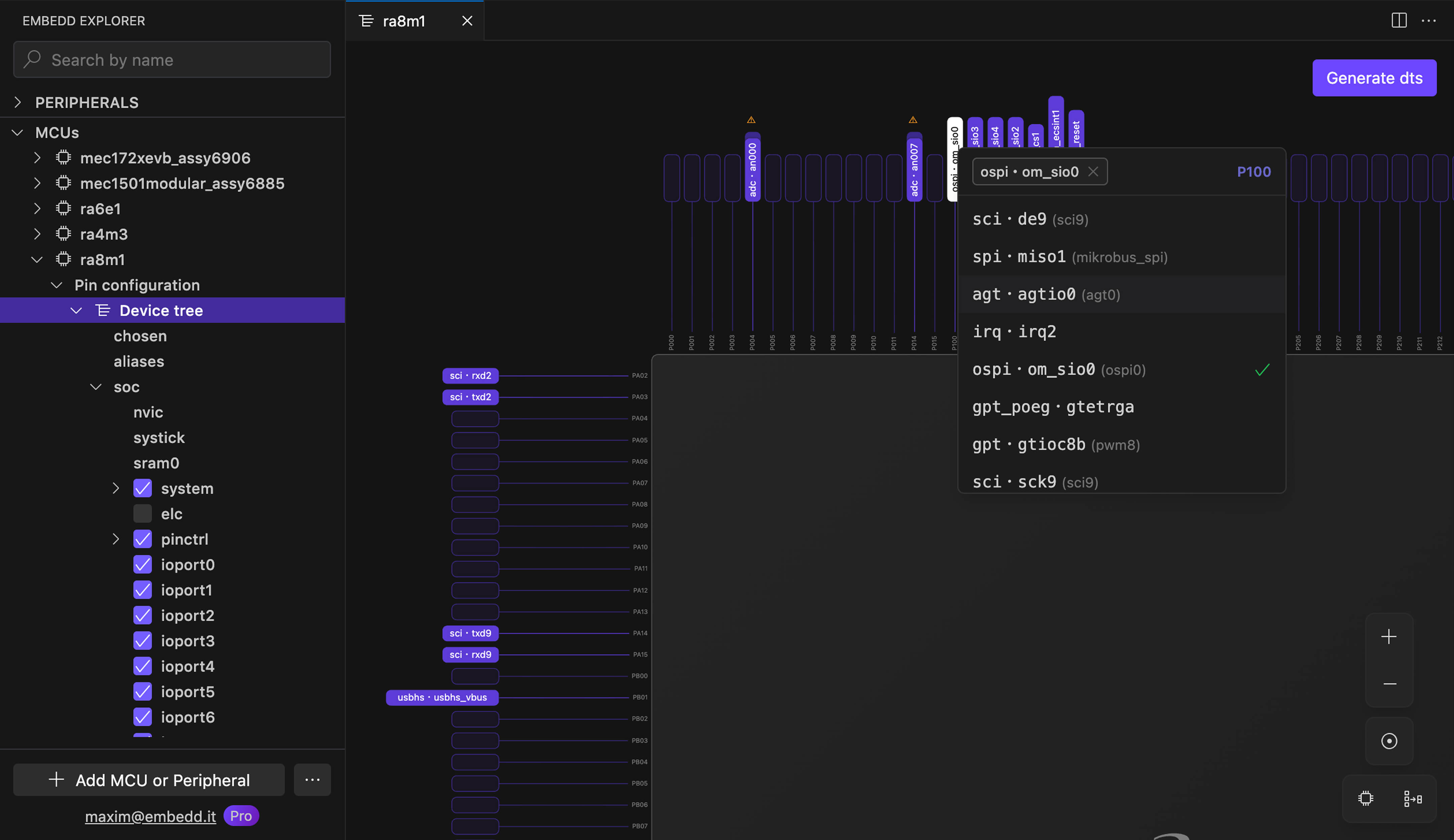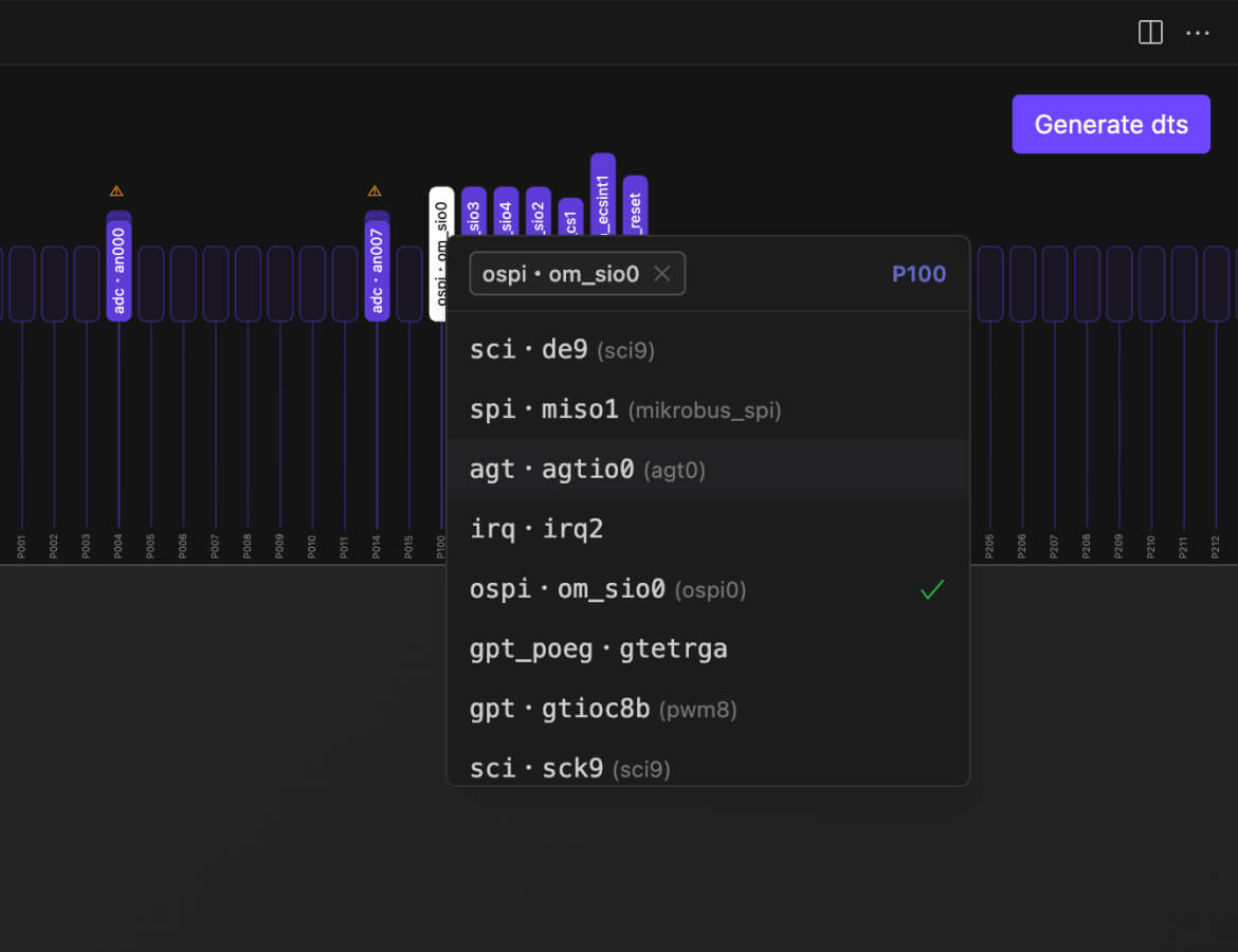 Configure pins, clocks, and interrupts in a vendor-agnostic environment. Generate validated device trees or bare metal configurations — no proprietary tools needed.
