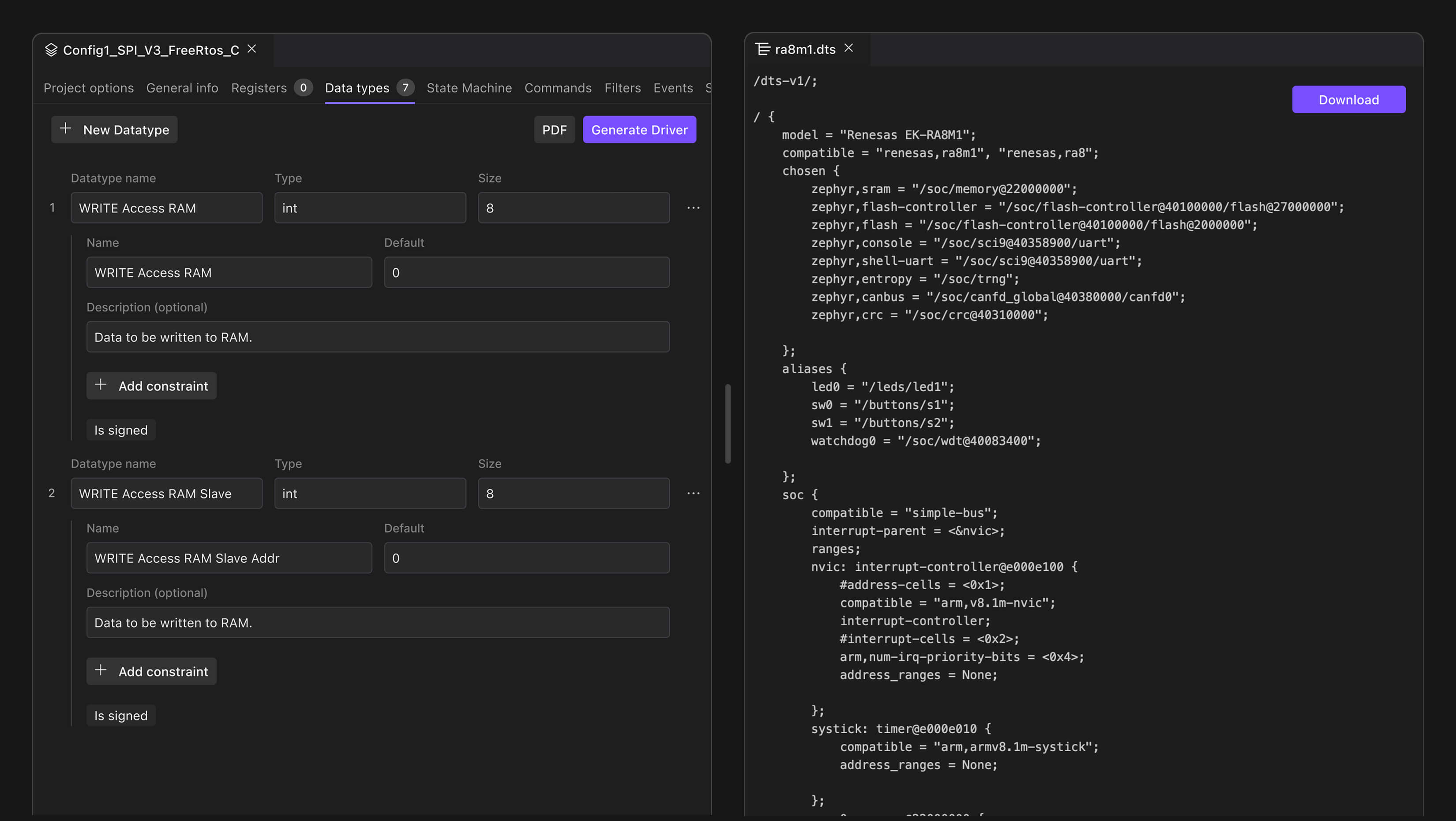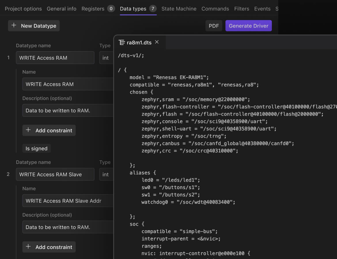 Select any component on your board and generate a production-ready driver. Control state machines, interrupts, and initialisation sequences. Retarget to a new architecture without rewriting.