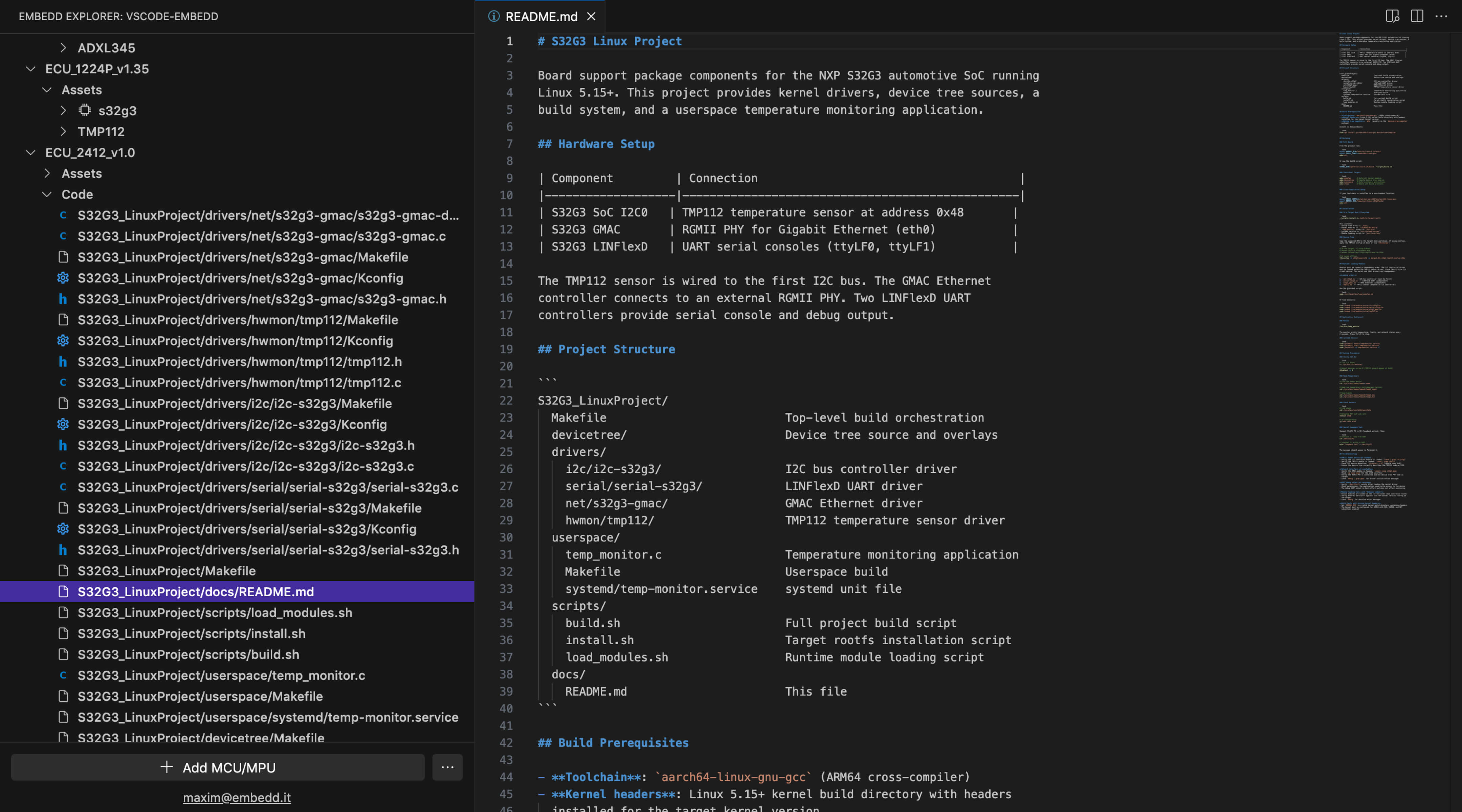Hardware setup, peripheral mapping, and driver API reference generated alongside the code.