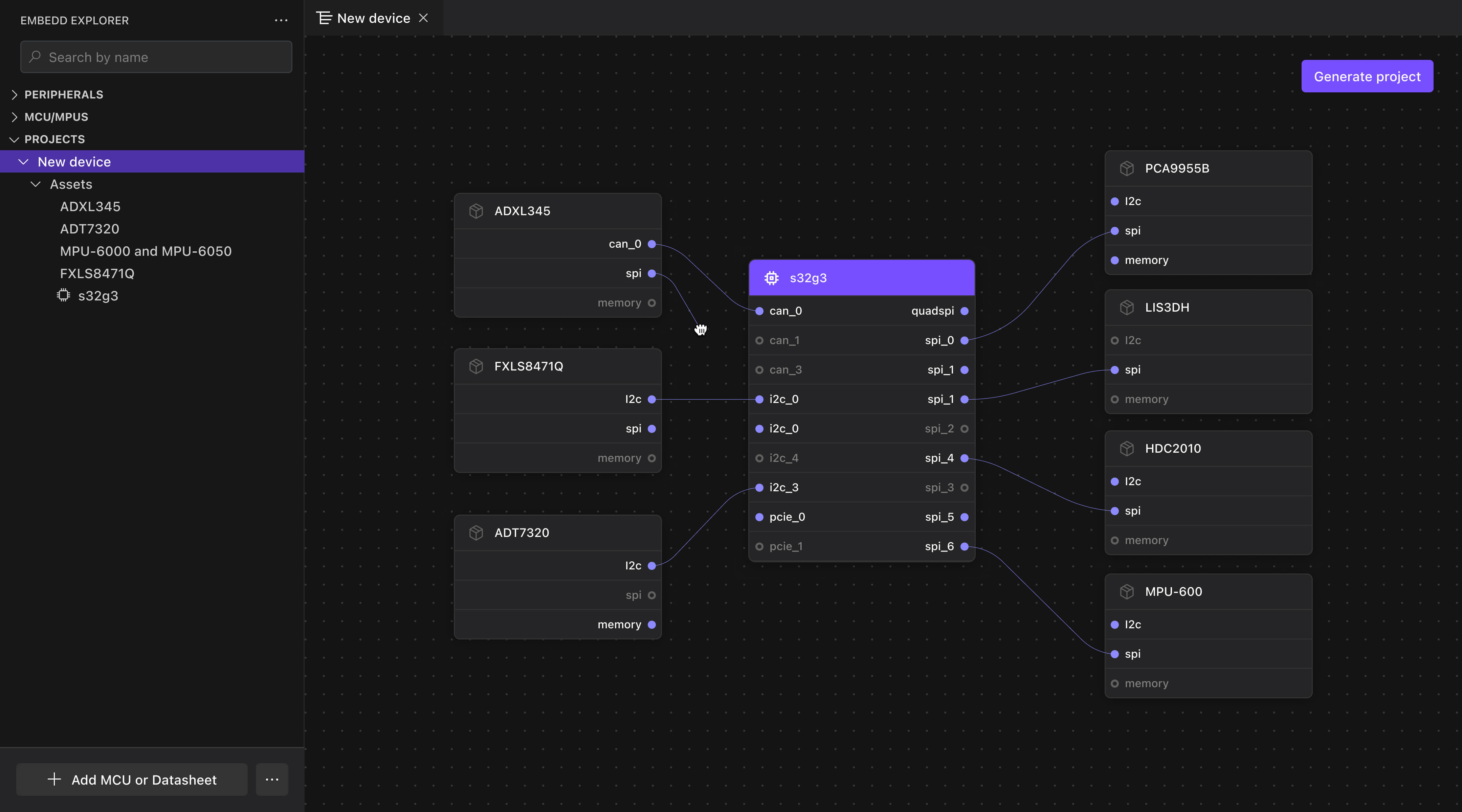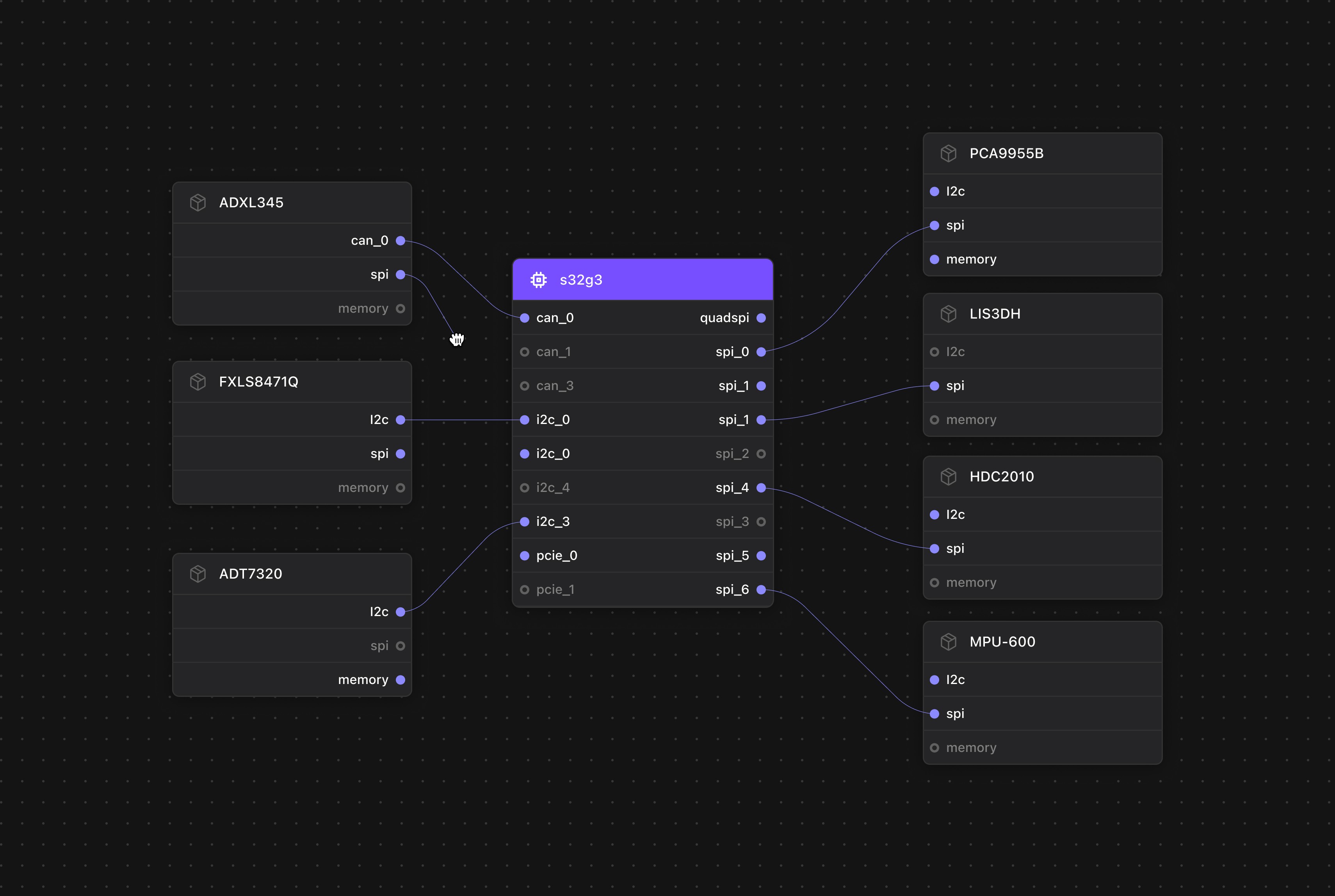 Define your architecture visually. Select your MCU/MPU, add peripherals, map how they connect, and check for second-source alternatives — all on an interactive schematic.